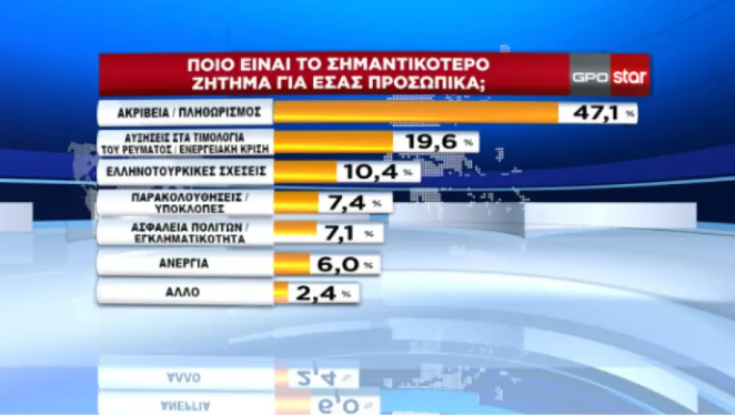 Εξάλλου, τo υπ’ αριθμόν ένα πρόβλημα φάνηκε πως είναι η ακρίβεια –κάτι που κατέδειξαν και άλλες έρευνες κοινής γνώμης (1, 2, 3, 4, 5)–, με το 47,1% να «δείχνει» τις ανατιμήσεις των προϊόντων ως κύρια πηγή ανησυχίας.