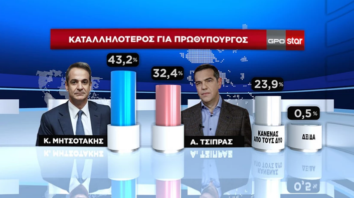 Το 43,2% θεωρεί καταλληλότερο τον νυν Πρωθυπουργό, έναντι του 32,4% των ερωτηθέντων που θεωρούν καταλληλότερο τον πρόεδρο του ΣΥΡΙΖΑ Αλέξη Τσίπρα.