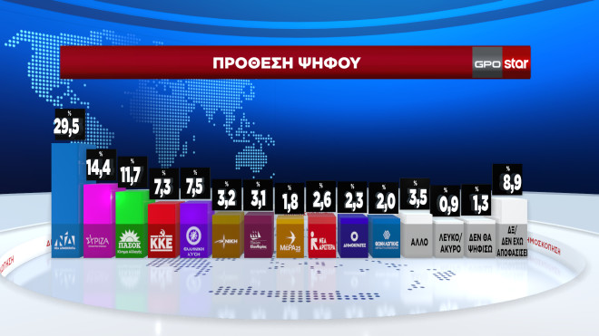 Προβάδισμα 16,9 μονάδων καταγράφει η Νέα Δημοκρατία έναντι του ΣΥΡΙΖΑ στη δημοσκόπηση της GPO που παρουσίασε στο κεντρικό δελτίο ειδήσεων του Star την Πέμπτη, 11 ημέρες πριν από τις ευρωεκλογές.