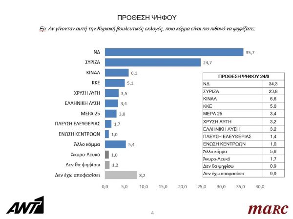 Στην πρόθεση ψήφου η ΝΔ συγκεντρώνει ποσοστό 35,7% έναντι 24,7% και αποτυπώνεται επτακομματική Βουλή καθώς ποσοστά πάνω από 3% έχουν ΜέΡΑ 25, Ελληνική Λύση και Χρυσή Αυγή.