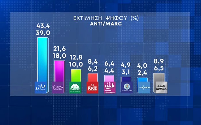 Στην εκτίμηση ψήφου η ΝΔ υπολογίζεται μεταξύ 39% και 43,4%, ο ΣΥΡΙΖΑ από 18% έως 21,6%, το ΠΑΣΟΚ-ΚΙΝΑΛ από 10% έως 12,8%, το ΚΚΕ από 6,2% έως 8,4%, η Πλεύση Ελευθερίας από 4,4% έως 6,4% και η Ελληνική Λύση από 3,1% έως 4,9%.