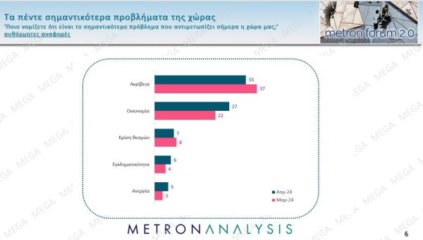 Ως σημαντικότερα προβλήματα για τους πολίτες καταγράφονται –για ακόμη μία φορά– η ακρίβεια (33%) και η οικονομία (27%). Ακολουθούν η κρίση θεσμών (7%), η εγκληματικότητα 6% και η ανεργία (5%).