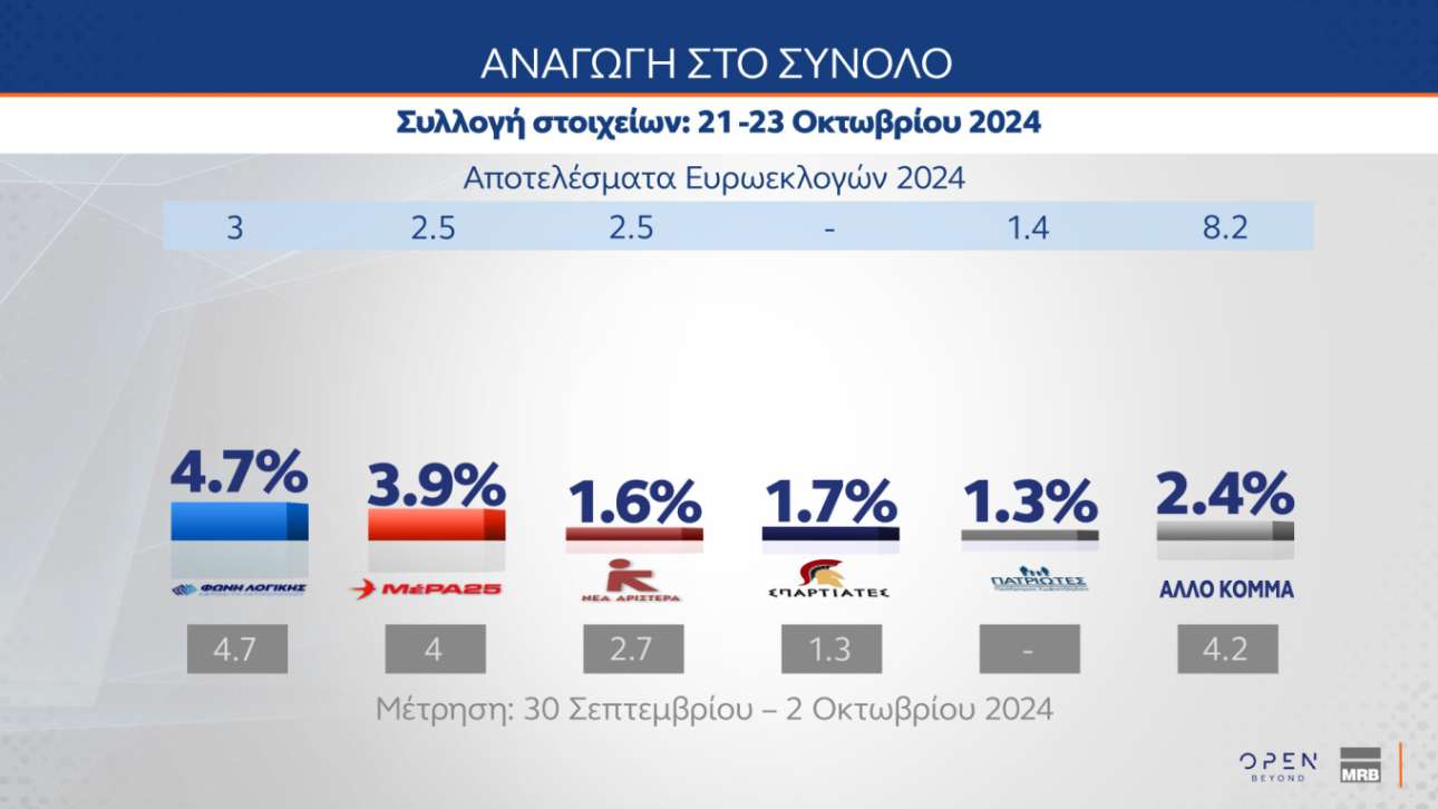 Η Πλεύση Ελευθερίας μετρήθηκε στο 5,3%, η Νίκη στο 3,8%, η Φωνή Λογικής στο 4,7% και το ΜέΡΑ25 3,9%. Στην ίδια μέτρηση η Νέα Αριστερά εμφανίστηκε να μένει εκτός Βουλής (1,6%).