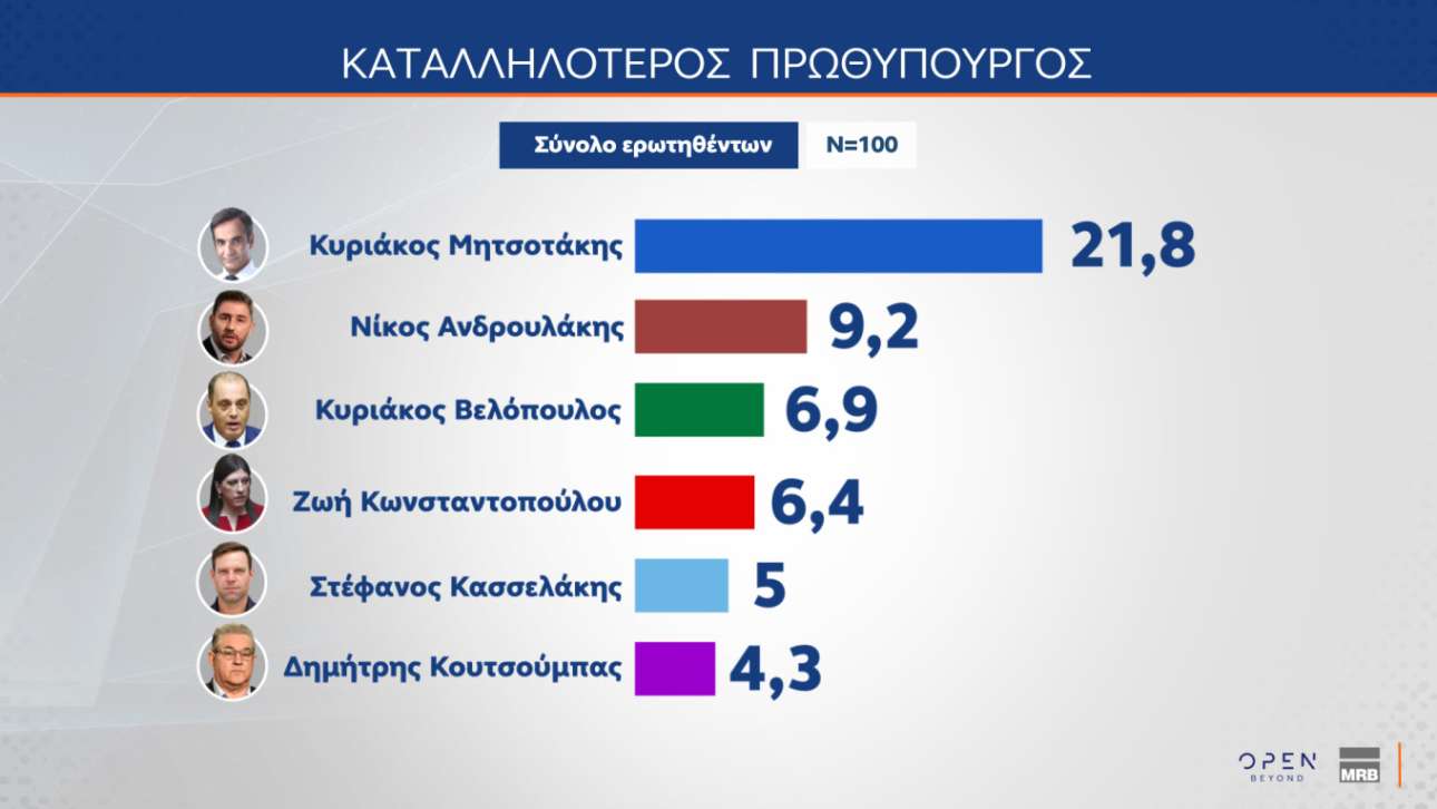 Στο ερώτημα για την καταλληλότερο πρωθυπουργό, πάντως, το ποσοστό του κ. Ανδρουλάκη πέφτει στο 9,2% ενώ ο Κυριάκος Μητσοτάκης εμφανίζεται κυρίαρχος (21,8%).