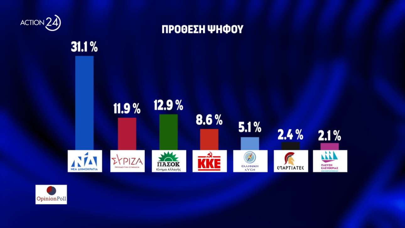Στην πρόθεση ψήφου της Opinion Poll η ΝΔ συγκέντρωσε ποσοστό 31,1%, ενώ το ΠΑΣΟΚ ήρθε και πάλι δεύτερο, με 12,9%.