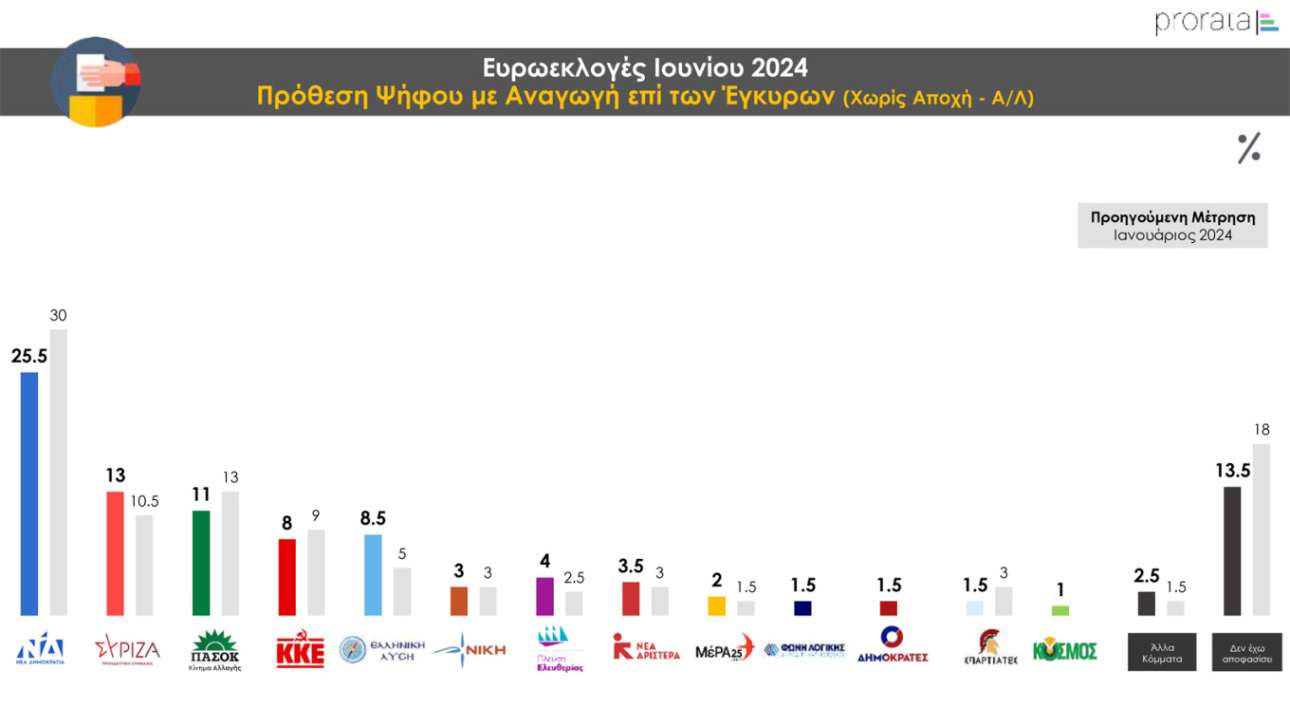 Δημοσκόπηση Prorata: Από 28% ως 32% η ΝΔ, από 13,5% ως 16,5% ο ΣΥΡΙΖΑ