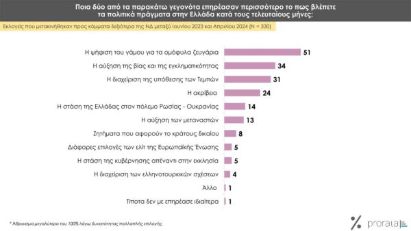 Oι εξελίξεις που επηρέασαν περισσότερο τους ψηφοφόρους αυτής της κατηγορίας ήταν η ψήφιση του νόμου για τα ομόφυλα ζευγάρια (51%), η αύξηση της εγκληματικότητας (34%), η διαχείριση της υπόθεσης των Τεμπών (31%) και η ακρίβεια (24%).