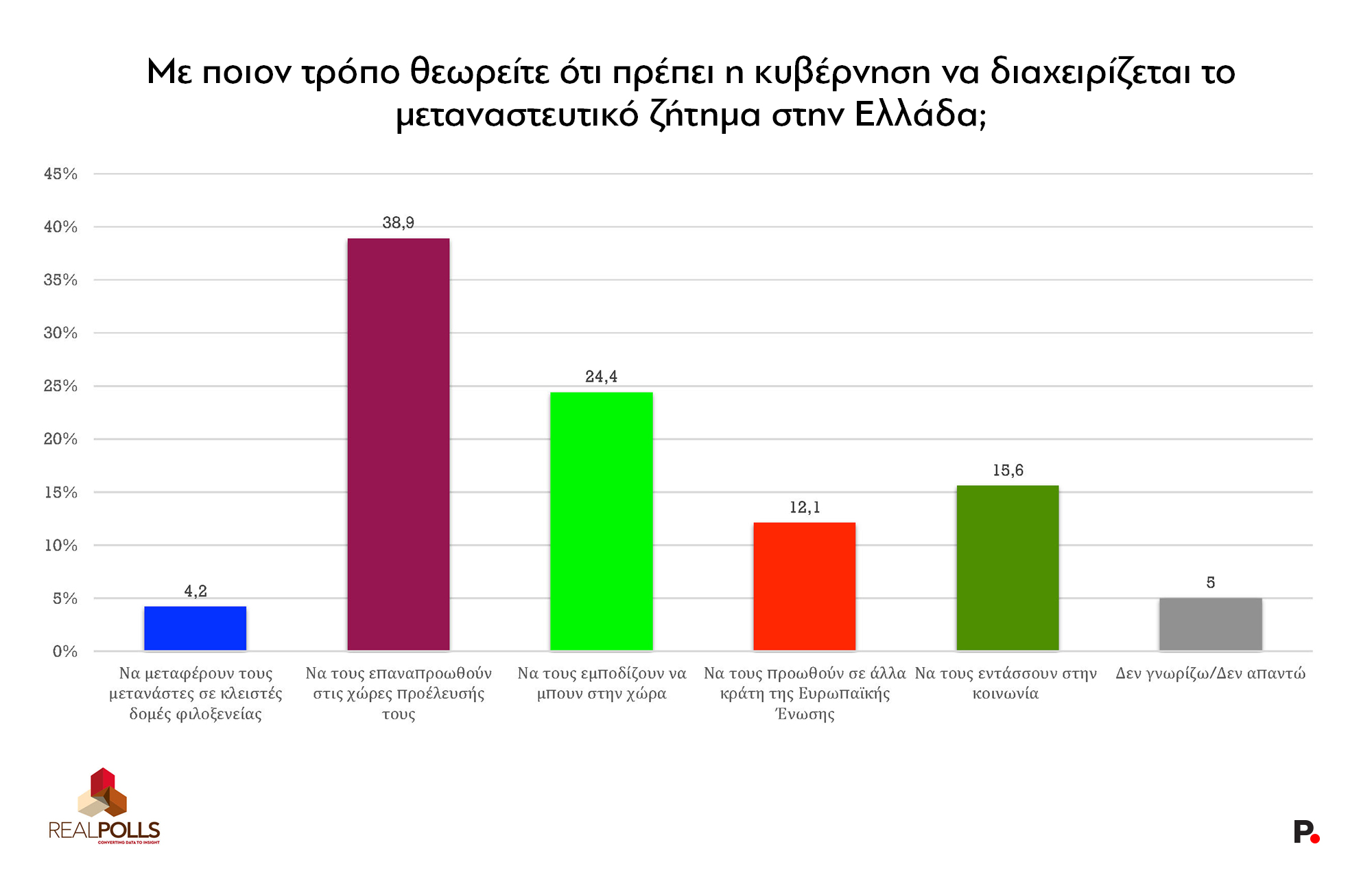 Στο Μεταναστευτικό (Πίνακας VII) φαίνεται πάντως ότι η κοινή γνώμη επιδοκιμάζει τη σκληρή γραμμή της κυβέρνησης, με το 38,9% να υποστηρίζει την επαναπροώθηση μεταναστών στις χώρες προέλευσης και το 24,4% την παρεμπόδιση εισόδου τους στην χώρα.