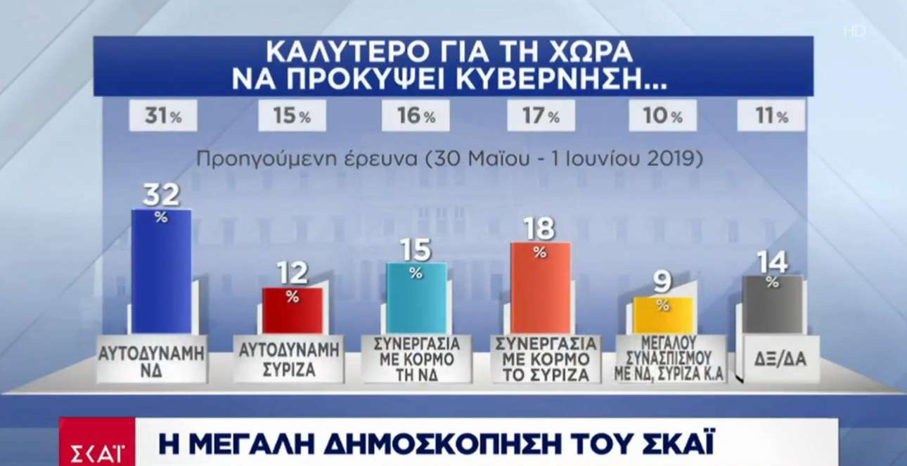 Οι πολίτες σε ποσοστό 32% λένε ότι πρέπει να προκύψει αυτοδυναμία της ΝΔ, 12% αυτοδυναμία ΣΥΡΙΖΑ, 15% συνεργασία με κορμό τη ΝΔ, 18%, συνεργασία με κορμό τον ΣΥΡΙΖΑ ενώ το 9% ζητά μεγάλο συνασπισμό ΝΔ με ΣΥΡΙΖΑ και άλλα κόμματα.