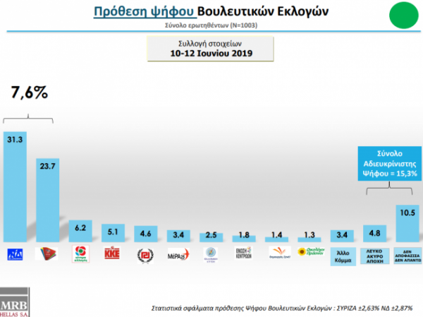 Η ΝΔ προηγείται στην πρόθεση ψήφου με 7,6 μονάδες, όμως, η διαφορά διευρύνεται και φθάνει τις 9 ποσοστιαίες μονάδες με αναγωγή βάσει της απλής αναγωγής στην κομματική προέλευση της αδιευκρίνιστης ψήφου.