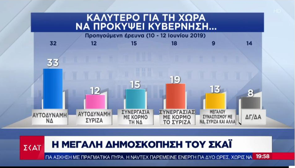 Στην ερώτηση ποιο σενάριο είναι καλύτερο για τη χώρα να προκύψει από τις κάλπες οι απαντήσεις είναι: Αυτοδύναμη ΝΔ 33%, Αυτοδύναμος ΣΥΡΙΖΑ 12%, κυβέρνησης συνεργασίας με κορμό τη ΝΔ 15%, κυβέρνησης συνεργασίας με κορμό το ΣΥΡΙΖΑ 19%, κυβέρνηση μεγάλου συνασπισμού 13%. Με άλλα λόγια οι ψηφοφόροι σε ποσοστό 48% θέλουν μια κυβέρνηση όπου με τον ένα ή τον άλλο τρόπο θέλουν τη ΝΔ να πρωταγωνιστεί στη διακυβέρνηση της χώρας.