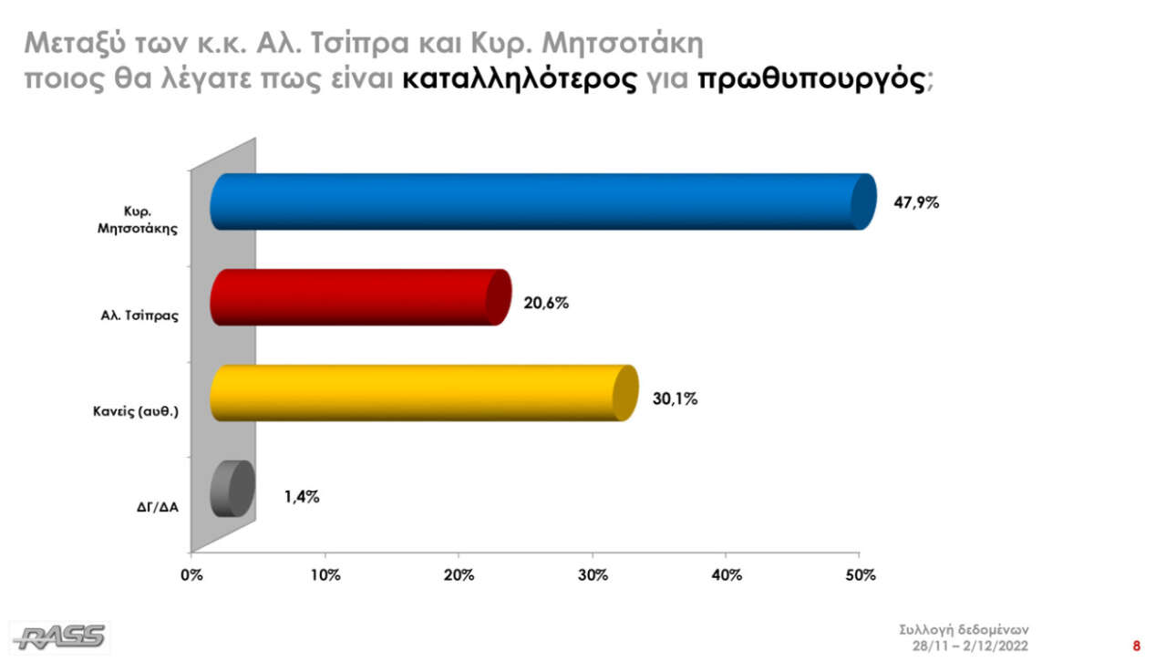 Εξάλλου, εν συγκρίσει με τον Αλέξη Τσίπρα (20,6%) οι πολίτες έκριναν τον Κυριάκο Μητσοτάκη (47,9%) ως καταλληλότερο Πρωθυπουργό, ενώ «κανείς» (30,1%) απάντησαν περισσότεροι ερωτηθέντες από όσους «ψήφισαν» τον πρόεδρο του ΣΥΡΙΖΑ.