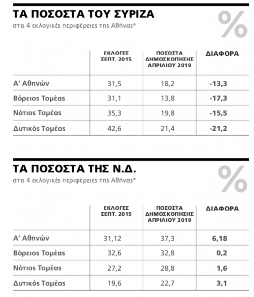 Με βάση πάντως τις μετρήσεις του «Πρώτου Θέματος», από την κατάρρευση του ΣΥΡΙΖΑ στη Β’ Αθηνών δεν κερδίζει σημαντικά η ΝΔ, σε αντίθεση με την Α’ Αθηνών όπου το κόμμα της αξιωματικής αντιπολίτευσης, σύμφωνα με την MRB αγγίζει το 37,3% έναντι 18,1% της κυβερνητικής παράταξης. Είναι χαρακτηριστικό ότι ο ΣΥΡΙΖΑ φαίνεται να χάνει περίπου τους μισούς ψηφοφόρους του στην Α’ Αθήνας, η οποία ταυτίζεται με τα όρια του Δήμου Αθηναίων και 17,8% από εκείνους που τον ψήφισαν τον Σεπτέμβριο του 2015 δηλώνουν τώρα ότι θα ψηφίσουν ΝΔ!