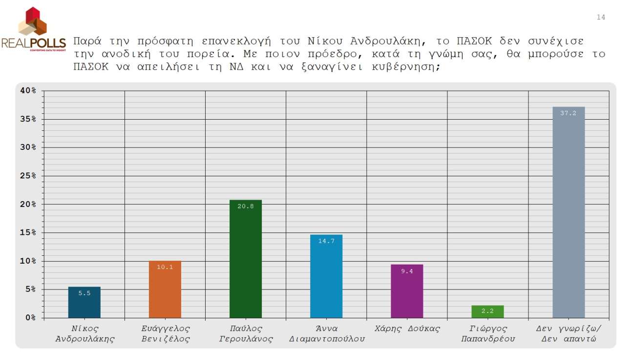 Είναι χαρακτηριστικό, ότι στο ερώτημα με ποιον πρόεδρο θα μπορούσε το ΠΑΣΟΚ να απειλήσει τη ΝΔ και να μπει σε κυβερνητική τροχιά, ο κ. Ανδρουλάκης παίρνει ένα μόλις 5,5%, ενώ ο Παύλος Γερουλάνος, βουλευτής Α’ Αθήνας και τρίτος της εκλογικής διαδικασίας του περασμένου φθινοπώρου, είναι πρώτος με 20,8% και η Αννα Διαμαντοπούλου, πρώην Επίτροπος και τέταρτη στις εσωκομματικές εκλογές, έρχεται δεύτερη με 14,7%.