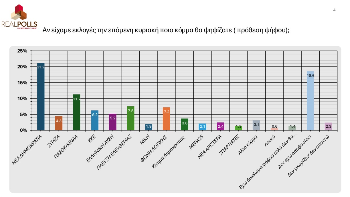 Συγκεκριμένα, στην πρόθεση ψήφου (Πίνακας I), η Νέα Δημοκρατία λαμβάνει 21,2% και είναι αδιαμφισβήτητα πρώτη, με το ΠΑΣΟΚ-Κίνημα Αλλαγής να βρίσκεται μακρά δεύτερο με 11,2%. Ακολουθεί η Πλεύση Ελευθερίας (7,5%), ενώ τέταρτη με 7,2% είναι η Φωνή Λογικής της Αφροδίτης Λατινοπούλου. Στην πέμπτη θέση μετρήθηκε το ΚΚΕ (6,2%), στην έκτη η Ελληνική Λύση του Κυριάκου Βελόπουλου (5,2%) και στην έβδομη ο ΣΥΡΙΖΑ με ένα γλίσχρο 4,3%. Εντός ορίων κοινοβουλευτικής εκπροσώπησης το Κίνημα Δημοκρατίας του Στέφανου Κασσελάκη (3,6%) και εκτός η Νέα Αριστερά (2,4%) και το ΜέΡΑ25 του Γιάνη Βαρουφάκη (2,1%). Ιδιαίτερο ενδιαφέρον έχουν τα χαμηλά ποσοστά της Νίκης που μετρήθηκε στο 1,9%.