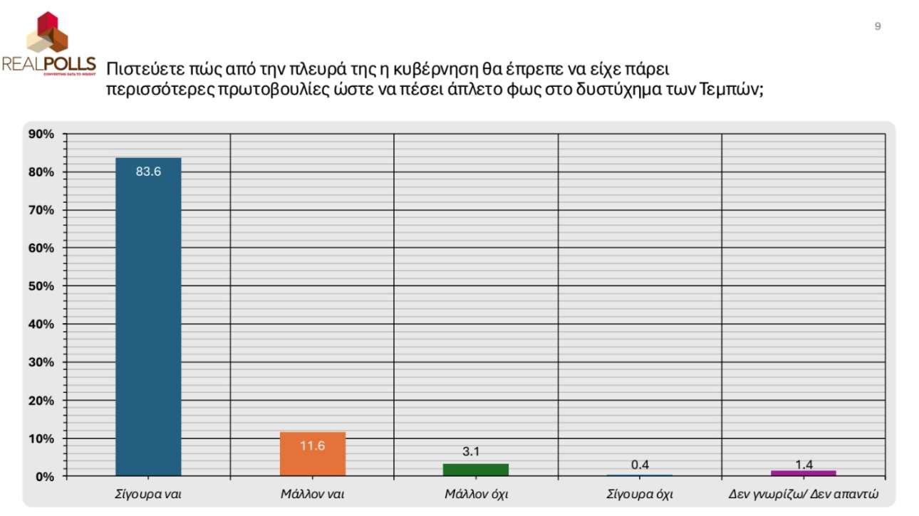 Για να έχουμε μια τάξη μεγέθους τού πόσο απείχε η κυβέρνηση από το κοινό αίσθημα σε αυτήν την υπόθεση, ένα συντριπτικό 95,2% των ερωτηθέντων στην έρευνα της RealPolls (δηλαδή και άτομα που δηλώνουν ψηφοφόροι της ΝΔ), πιστεύει ότι η κυβέρνηση θα έπρεπε να έχει πάρει περισσότερες πρωτοβουλίες ώστε να πέσει άπλετο φως στο σιδηροδρομικό αυτό δυστύχημα (Πίνακας IV).