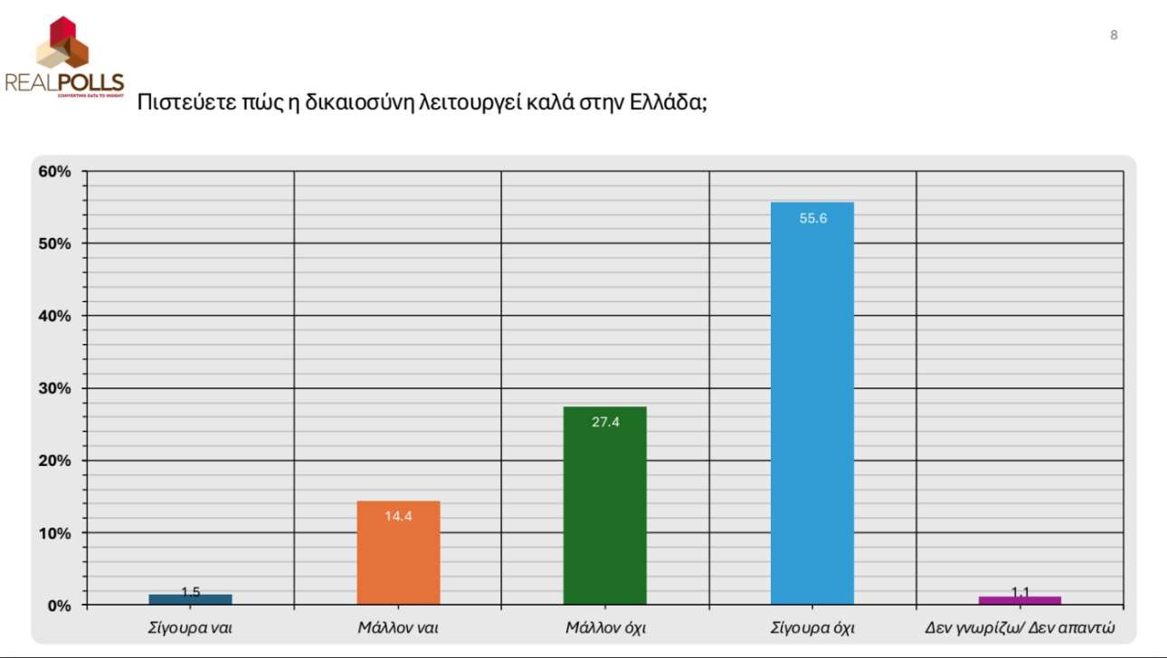 Σίγουρο για την καλή λειτουργία της Δικαιοσύνης στη χώρα μας δηλώνει μόνο το 1,5% των ερωτηθέντων!