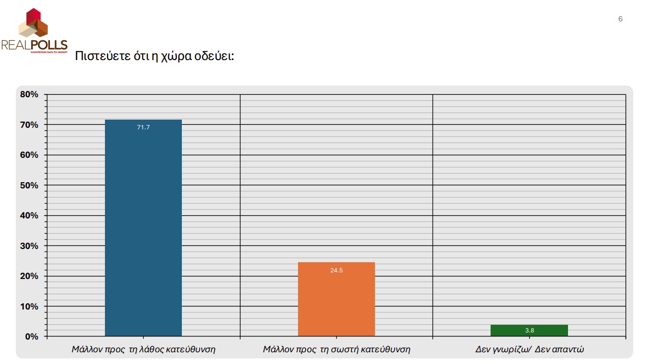 Σε κάθε περίπτωση –και αυτό είναι κάτι που πρέπει να απασχολήσει σοβαρά και την κυβέρνηση και την αντιπολίτευση– διαπιστώνεται μια γενικευμένη απογοήτευση αλλά και ανησυχία των πολιτών για το μέλλον. Είναι ενδεικτικό ότι περισσότεροι από επτά στους δέκα (71,7%) πιστεύουν ότι η χώρα οδεύει μάλλον προς τη λάθος κατεύθυνση, ενώ μόλις ένας στους τέσσερις (24,5%) πιστεύει ότι οδεύουμε προς τη σωστή κατεύθυνση (Πίνακας X).