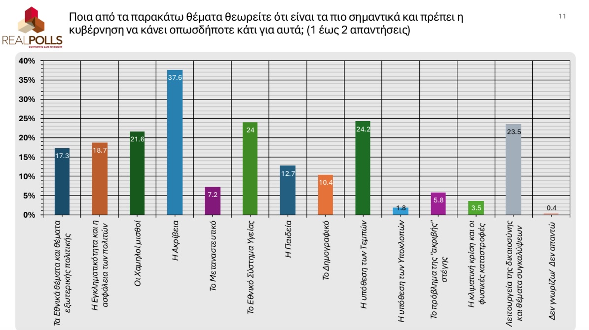 Χαρακτηριστικό τού πόσο τα Τέμπη απασχολούν τους πολίτες και ψηφοφόρους είναι το πόσο ψηλά αξιολογούν την υπόθεση αυτή, απαιτώντας από την κυβέρνηση να πράξει κάτι (Πίνακας III): Μετά την ακρίβεια (37,6%), η υπόθεση της σιδηροδρομικής τραγωδίας της 28ης Φεβρουαρίου 2023 έρχεται σε δεύτερη θέση (24,2%), ενώ έπεται το σύστημα υγείας (24%). Οι χαμηλοί μισθοί είναι τέταρτο πρόβλημα, η εγκληματικότητα πέμπτο και τα εθνικά θέματα έκτο.