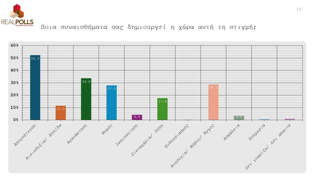 Τα δε αρνητικά συναισθήματα των πολιτών για τη χώρα είναι κυρίαρχα στο εθνικό θυμικό. Οι μισοί, ποσοστό 52,3%, δηλώνουν ότι η Απογοήτευση είναι το συναίσθημα που τους δημιουργεί η χώρα αυτή τη στιγμή, ενώ δεύτερο έρχεται η Αγανάκτηση (33,6%), τρίτο το τρίπτυχο Ανησυχία-Φόβος-Αγχος (28,7%) και τέταρτο ο Θυμός (27,9%). Αισιοδοξεί και ελπίζει μόλις το 11,5%. (Πίνακας ΧΙ)