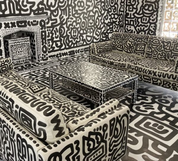 Τα σεντόνια, το κάθισμα της τουαλέτας, τα σκεύη μαγειρέματος, τα φωτιστικά, ακόμη και το ποντίκι του υπολογιστή είναι όλα ζωγραφισμένα με μαύρες κουκκίδες (doodles) – ούτε ένα σημείο δεν έχει μείνει κενό.