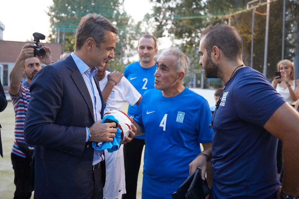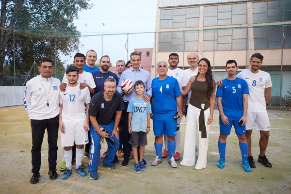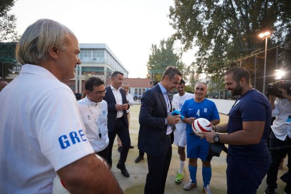 Ο κ. Μητσοτάκης συνάντησε τους παίκτες της Εθνικής μας Ομάδας κατά τη διάρκεια της προπόνησής τους στο Εθνικό Γυμναστήριο Μίκρας, όπου προετοιμάζονται εντατικά για την τελική φάση του Πανευρωπαϊκού Πρωταθλήματος Ποδοσφαίρου Τυφλών που θα διεξαχθεί στη Ρώμη από τις 15 έως τις 25 Σεπτεμβρίου.