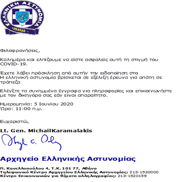 Διακινείται μέσω μηνυμάτων ηλεκτρονικού ταχυδρομείου (e-mails) από δράστες που επιχειρούν να παραπλανήσουν και να εξαπατήσουν τους πολίτες.