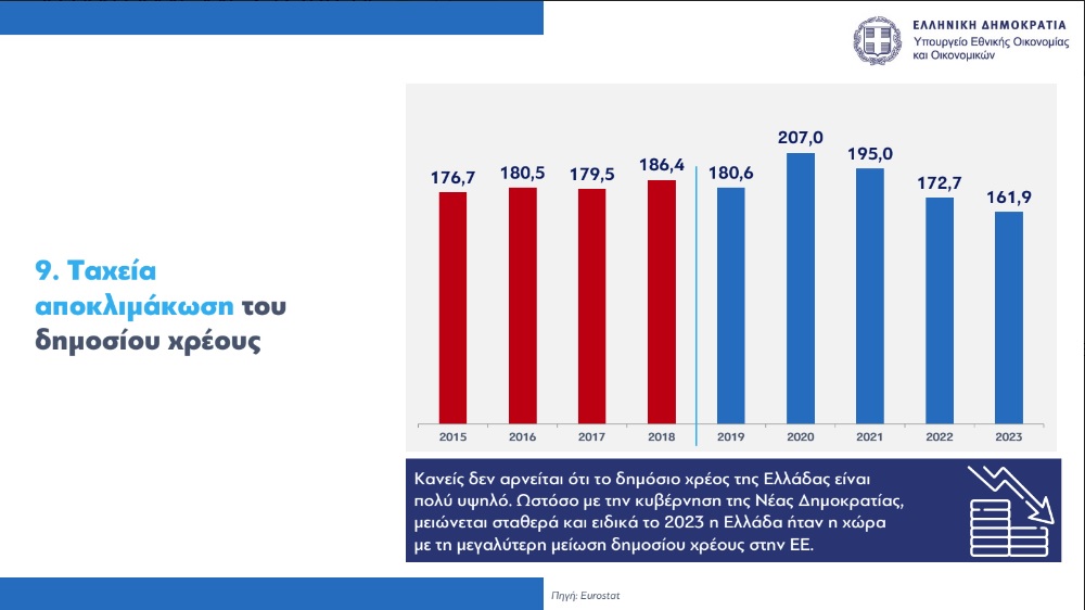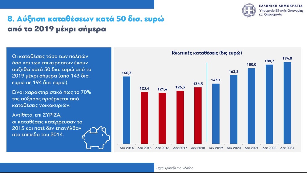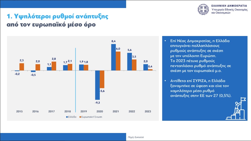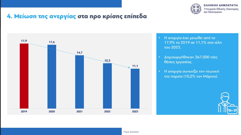 Με αναλυτικά στοιχεία 12 σημείων για την πορεία της οικονομίας που δείχνουν ότι η Ελλάδα έχει από τους υψηλότερους ρυθμούς ανάπτυξης στην Ευρωπαϊκή Ενωση, ενώ η ανεργία μειώθηκε τα τελευταία χρόνια πάνω από επτά μονάδες, δημοσιοποίησε τη Δευτέρα ο υπουργός Εθνικής Οικονομίας και Οικονομικών, Κωστής Χατζηδάκης, απαντώντας έτσι στην κριτική των κομμάτων της αντιπολίτευσης για την ακρίβεια και τα χαμηλά πραγματικά εισοδήματα.