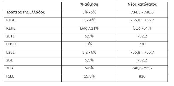 • Η ΓΣΕΕ προτείνει αύξηση της τάξης του 15,8% ώστε ο νέος κατώτατος μισθός να ανέλθει στα 826 ευρώ.
