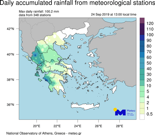 Παράλληλα, πολύ μεγάλα ύψη βροχής καταγράφηκαν από το δίκτυο αυτόματων μετεωρολογικών σταθμών του Εθνικού αστεροσκοπείου Αθηνών / meteo.gr (δείτε κάτω τον σχετικό χάρτη). Χαρακτηριστική είναι η περίπτωση του σταθμού του Πύργου Ηλείας, όπου καταγράφηκαν 100 χιλιοστά βροχής.
