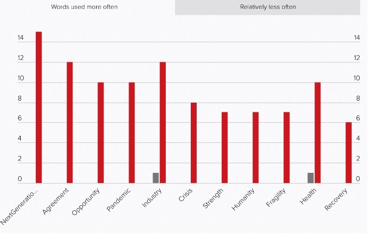 Τα αποτελέσματα, που στο σχέδιο του Politico απεικονίζονται με στήλες, δείχνουν ότι τις λέξεις «υγεία/health» και «βιομηχανία/industry» η Φον ντερ Λάιεν τις είπε περισσότερες φορές στην πρόσφατη ομιλία της, ενώ χρησιμοποίησε και ολοκαίνουργιες λέξεις ή λέξεις-φράσεις, τις οποίες δεν είχε καν αναφέρει στην ομιλία του περσινού Νοεμβρίου, όπως είναι οι «επόμενη γενιά/next gemeration», «συμφωνία/agreement», «ευκαιρία/opportunity», «πανδημία/pandemic», «κρίση/crisis», «σθένος/strength», «ανθρωπιά/humanity», «ευαισθησία/fragility», «ανάκαμψη/recovery».