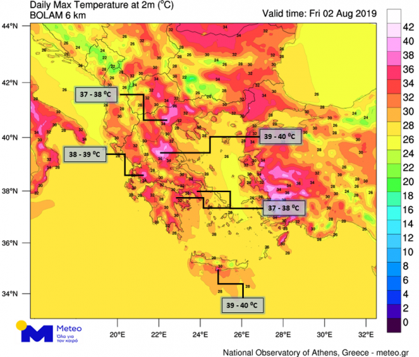 Οι μέγιστες θερμοκρασίες τις μεσημεριανές ώρες έφτασαν και οριακά ξεπέρασαν τους 39 ⁰C στη Μακεδονία, τη Θεσσαλία και τη Βορειοδυτική Πελοπόννησο.
