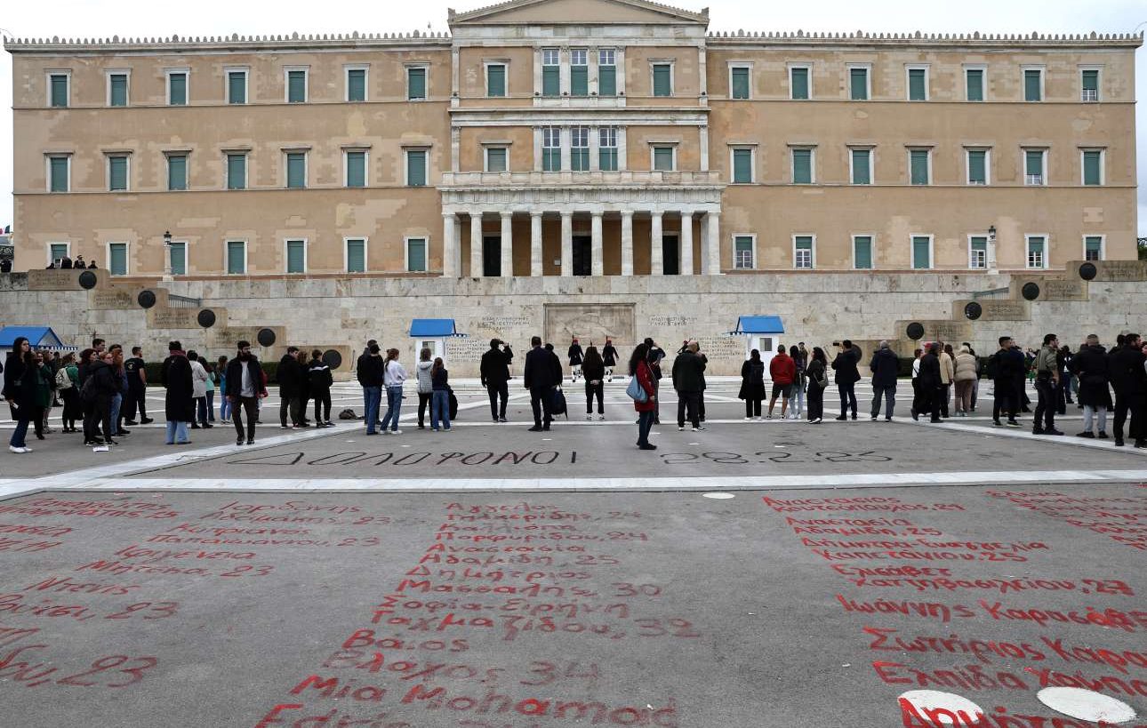 Στο περιθώριο της μεγάλης διαδήλωσης της Τετάρτης, για τον έναν χρόνο από το πολύνεκρο σιδηροδρομικό δυστύχημα της 28ης Φεβρουαρίου 2023, κάποιοι διαδηλωτές που ήταν συγκεντρωμένοι στο Σύνταγμα ξεκίνησαν το μεσημέρι να γράφουν μπροστά από το κοινοβούλιο, με κόκκινη μπογιά, όλα τα ονόματα των 57 θυμάτων της τραγωδίας.