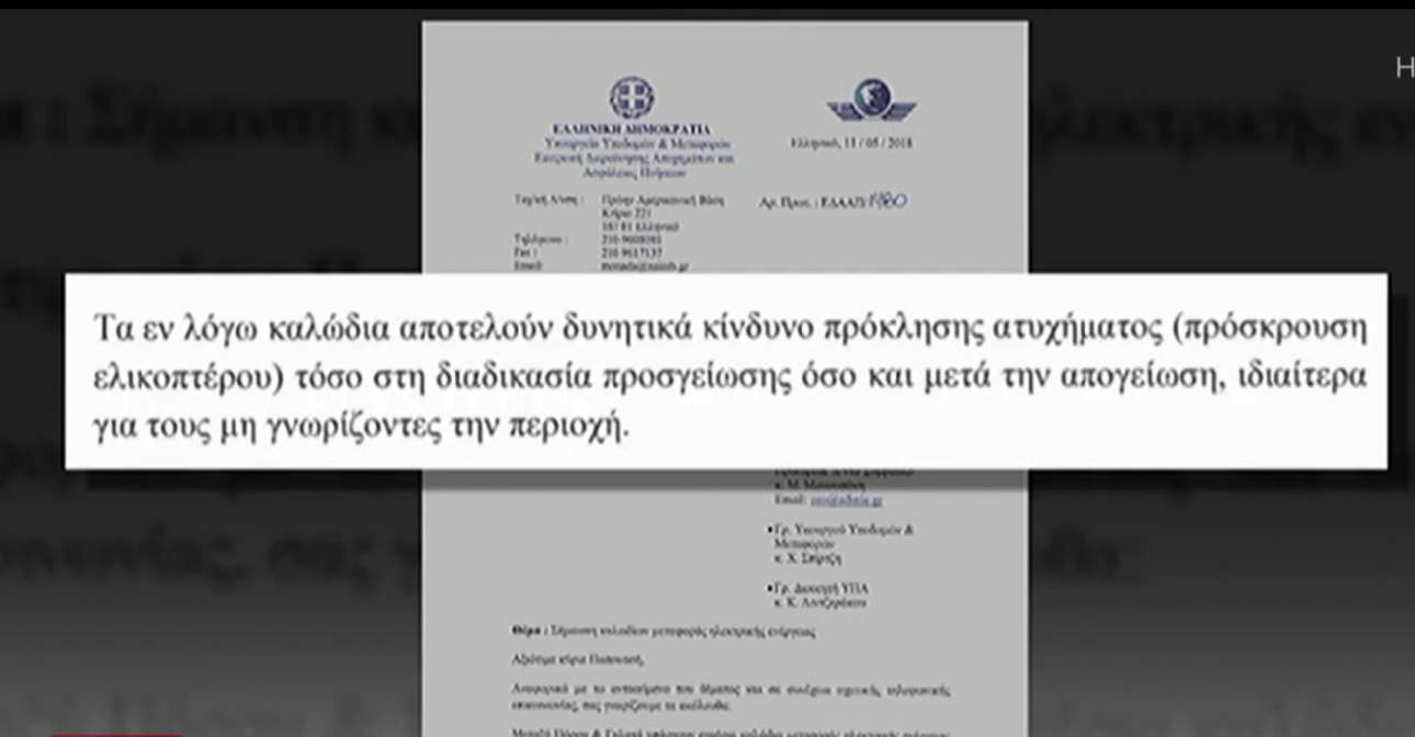 Οπως αποδεικνύεται ωστόσο, τον Μάιο του 2018 ο τότε πρόεδρος της Επιτροπής Διερεύνησης Ατυχημάτων και Ασφάλειας Πτήσεων, Αθανάσιος Μπίνης, ζητούσε με έγγραφό του (φωτογραφία κάτω) προς τους αρμόδιους φορείς την τοποθέτηση ειδικής σήμανσης στα καλώδια (ανακλαστήρων), ώστε να προειδοποιούνται οι πιλότοι.