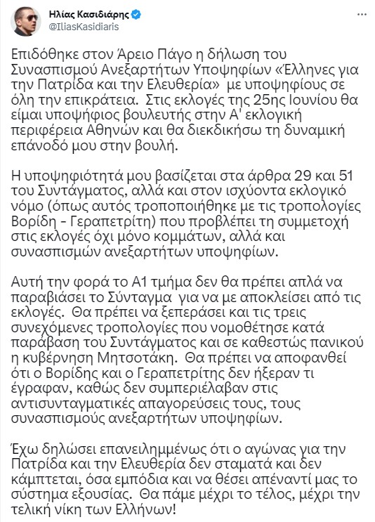 Σύμφωνα με ανάρτηση του Ηλία Κασιδιάρη στα μέσα κοινωνικής δικτύωσης (βλ. παρακάτω), θα είναι υποψήφιος βουλευτής στην Α’ Αθηνών.