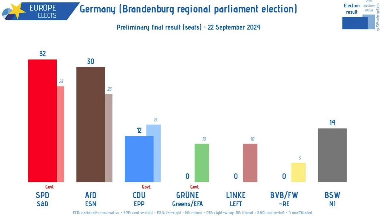 Το Σοσιαλδημοκρατικό Κόμμα (SPD) κέρδισε τις εκλογές στο Βρανδεμβούργο, με ποσοστό 30,9% (+4,7 από το 2019), αφήνοντας στην δεύτερη θέση την ακροδεξιά παράταξη Εναλλακτική για την Γερμανία (AfD) με 29,2% (+5,7).