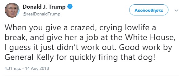 Σε συνέχεια προηγουμένων επεισοδίων της «υπόθεσης Ομαρόζα» με τις αποκαλύψεις της πρώην εξ απορρήτων του Ντόναλντ Τραμπ, Ομαρόσα Μάνιγκολτ Νιούμαν, ο αμερικανός πρόεδρος ανήρτησε στο Twitter το παρακάτω απίστευτα οργισμένο μήνυμα: «Οταν δίνεις μια ευκαιρία σε μια τρελή, σε ένα ρεμάλι που κλαψουρίζει, όταν της δίνεις μια δουλειά στον Λευκό Οίκο, φαντάζομαι ότι αυτό δεν λειτούργησε. Καλή δουλειά από τον στρατηγό Κέλι που απέλυσε γρήγορα αυτό το σκυλί!» έγραψε.