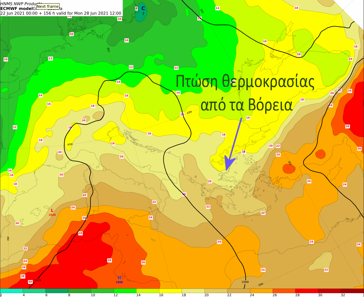 Σύμφωνα με τα πρώτα διαθέσιμα προγνωστικά στοιχεία η ζέστη πρόσκαιρα θα υποχωρήσει την ερχόμενη Δευτέρα (28-06-2021).