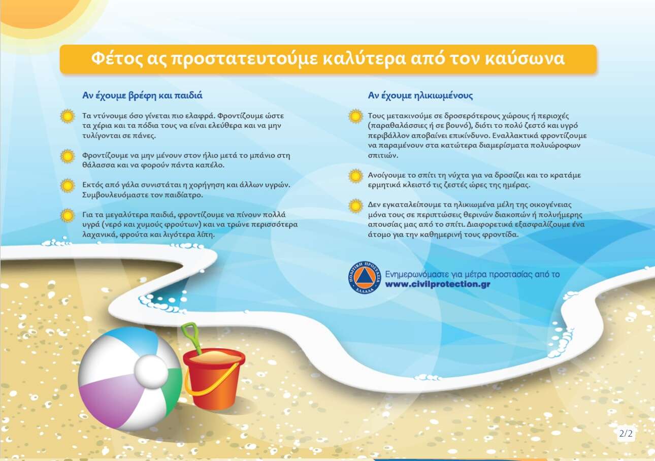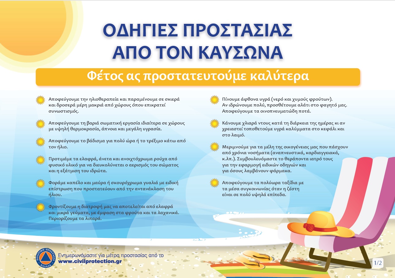 Σας συστήνουμε να λαμβάνετε υπόψη σας τις οδηγίες της ΓΓΠΠ σχετικά με τις υψηλές θερμοκρασίες σε περιόδους καύσωνα . Σε κάθε περίπτωση θα πρέπει να γνωρίζετε ότι η ΕΜΥ λαμβάνει υπόψη της όλα τα διαθέσιμα προγνωστικά στοιχεία και μετά από σχετική αξιολόγησή τους, εκδίδει τα ειδικά δελτία πρόγνωσης και προειδοποιήσεων, καθώς και τη σχετική ανάλυση της προβλεπόμενης εξέλιξης του καιρού, καταλήγει στη σχετική ενημέρωση ο διευθυντής Εθνικού Μετεωρολογικού Κέντρου ΕΜΥ Θεόδωρος Ν. Κολυδάς.