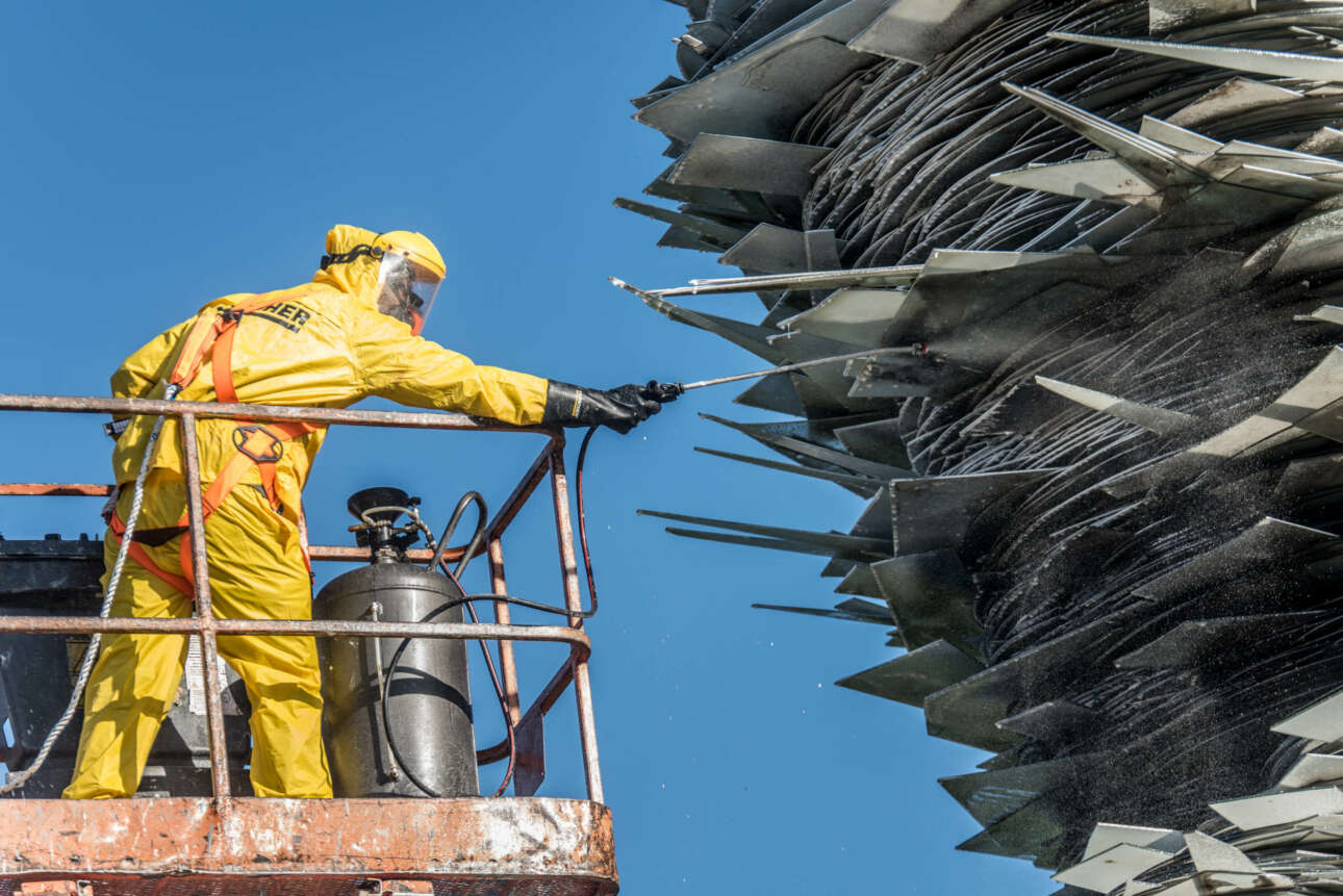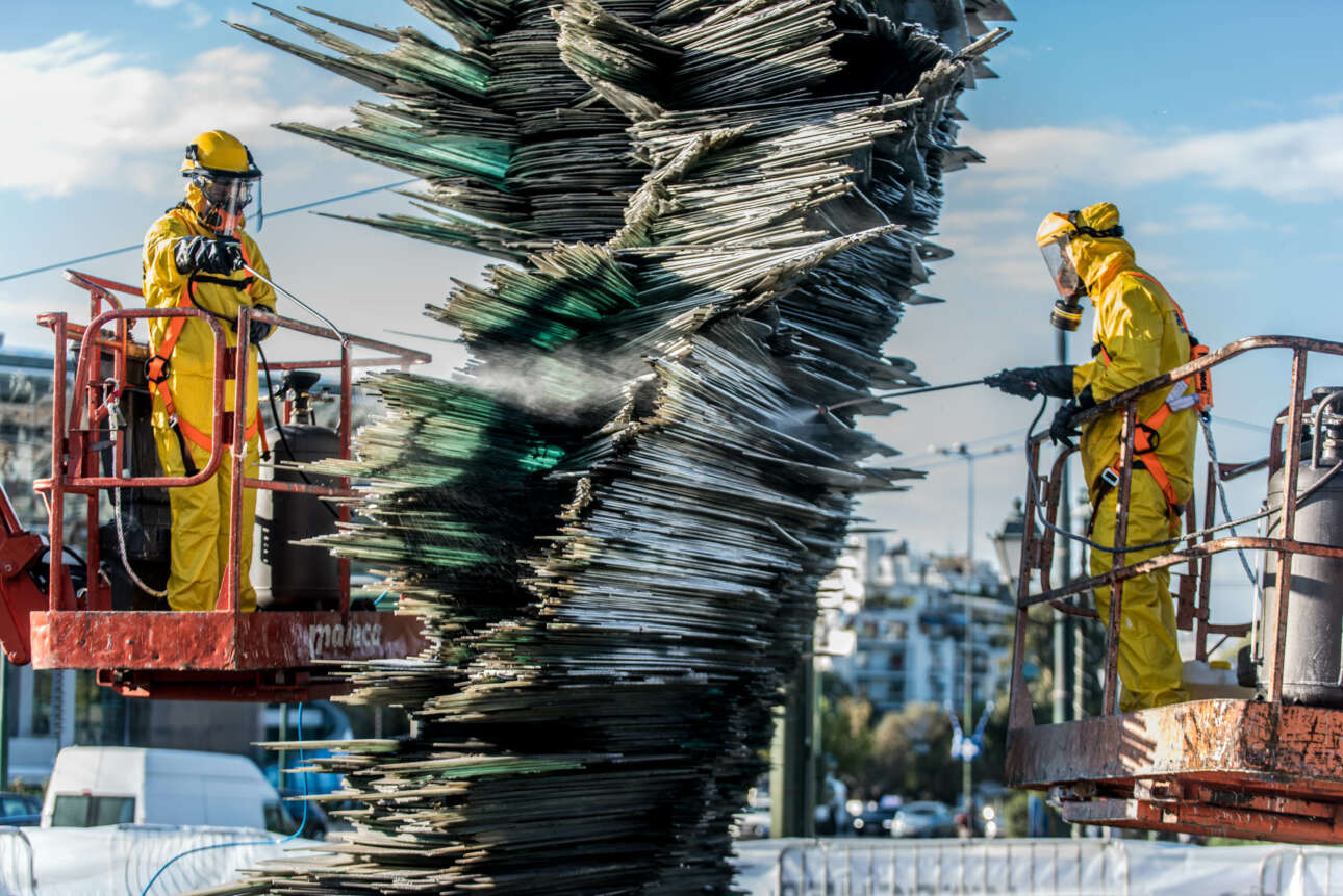 «Λόγω της θέσης του γλυπτού, υπάρχουν ουσίες οι οποίες κάθονται πάνω στο γυαλί. Δεν μιλάμε για απλή σκόνη αλλά κατά κύριο λόγο για ρύπους, το οποίο σημαίνει ότι απαιτείται μια ειδική διαδικασία καθαρισμού», εξήγησε στο ΑΠΕ-ΜΠΕ ο αντιδήμαρχος αρμόδιος για την καθαριότητα και την ανακύκλωση, Νίκος Αβραμίδης.