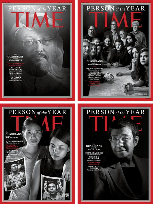 Το περιοδικό επέλεξε επίσης τους δημοσιογράφους Τζαμάλ Κασόγκι που έπεσε θύμα δολοφονίας, τις Γουά Λονέ και Κιάου Σόε Ο που φυλακίστηκαν στην Μιανμάρ αλλά και τους πέντε δημοσιογράφους της Capital Gazzette που έχασαν την ζωή τους μετά από επίθεση στα γραφεία της εφημερίδας.