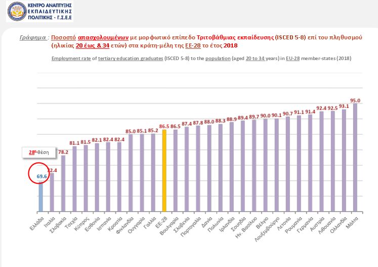 -Το 2018, η Ελλάδα κατείχε την τελευταία θέση στην ΕΕ των 28, με ποσοστό 69,6%, σε απασχολούμενους αποφοίτους Τριτοβάθμιας εκπαίδευσης ηλικίας 20-34 ετών και με ποσοστό 55,3%, σε απασχολούμενους αποφοίτους τουλάχιστον ανώτερης δευτεροβάθμιας εκπαίδευσης ηλικίας 20-34 ετών.