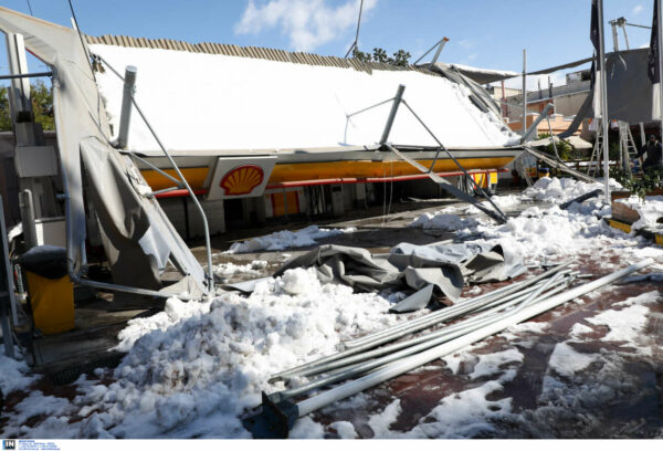 Στέγαστρο σε βενζινάδικο στο Χαϊδάρι δεν άντεξε το βάρος του συσσωρευμένου χιονιού και κατέρρευσε προκαλώντας εκτεταμένες ζημιές.