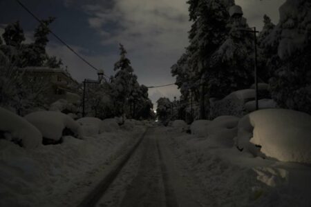 Ανάλογες εικόνες και στον Διόνυσο όπου η χιονόπτωση -και η χιονόστρωση- ήταν μεγάλη, αφήνοντας χωρίς ηλεκτρικό ρεύμα περίπου του 80% σπιτιών και επιχειρήσεων (κάτω οι φωτογραφίες από βενζινάδικο της περιοχής).