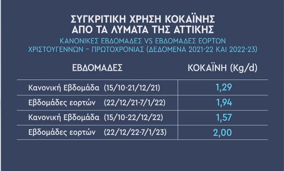 Αναλύοντας τα ενδιαφέροντα ευρήματα στα λύματα της περιφέρειας Αττικής ο κ. Θωμαΐδης εστίασε στην αύξηση των ναρκωτικών ουσιών που παρατηρήθηκε το ίδιο διάστημα, δηλαδή τις ημέρες των εορτών.