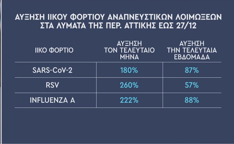 Η τελευταία εβδομάδα του 2023 έδειξε αυξήσεις της τάξης του 85%-90% σε αυτούς τους ιούς, διευκρίνισε, προσθέτοντας πως «οι αναλύσεις στα λύματα δεν λένε ποτέ ψέματα γιατί είναι πραγματικές μετρήσεις σε πραγματικό χρόνο».