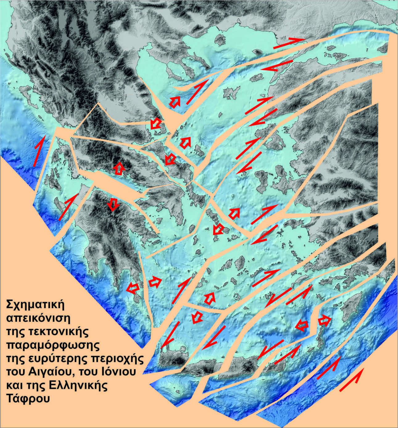 Συνολικά, η ευρύτερη περιοχή της «μικροπλάκας του Αιγαίου» επεκτείνεται προς Νότο. Η μετακίνηση της Κρήτης προς τα νότιο-νοτιοδυτικά με ταχύτητα 30-35 μέτρων ανά 1.000 χρόνια σε σχέση με τη Βόρεια Ελλάδα αντιπροσωπεύει τη συνολική παραμόρφωση της μικροπλάκας. Αυτή η παραμόρφωση προκύπτει σαν συνολικό αποτέλεσμα των μετακινήσεων που γίνονται κατά μήκος των πολυάριθμων ρηγμάτων και ρηξιγενών ζωνών που διατρέχουν την περιοχή.