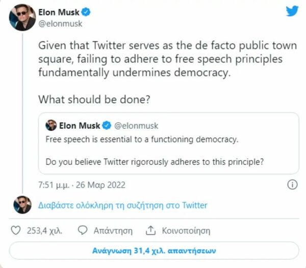 Μόλις πριν από μερικές ημέρες, ο Μασκ είχε επικρίνει την εταιρεία μέσω poll στον λογαριασμό του στο Twitter, όπου διερωτήθηκε δημοσίως εάν η πλατφόρμα συμμορφώνεται με τις αρχές της ελευθερίας του λόγου. «Δεδομένου ότι το twitter λειτουργεί de facto ως η δημόσια πλατεία του χωριού, η αδυναμία του να τηρήσει τις αρχές της ελευθερίας του λόγου υποβαθμίζει σε θεμελιώδη βαθμό την δημοκρατία. Τι θα έπρεπε να συμβεί;» διερωτήθηκε.
