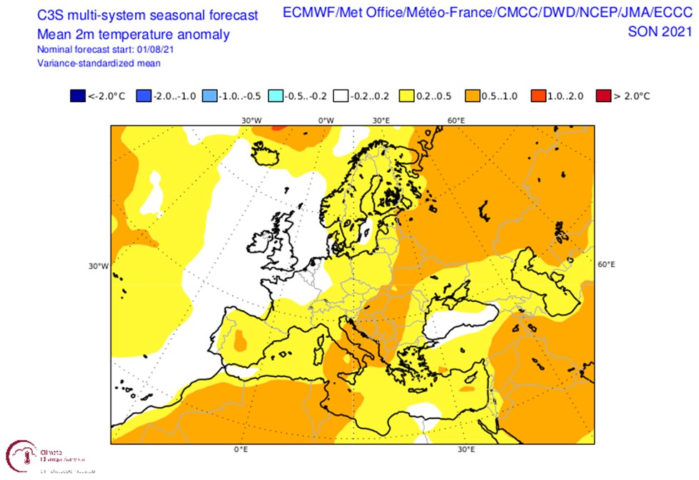 Προγνωστικοί χάρτες του ECMWF και του C3S multi-modelsystem με τις αποκλίσεις της θερμοκρασίας για το φθινόπωρο του 2021 (3-month average), με αρχικές τιμές της 01/08/2021