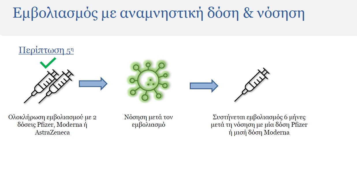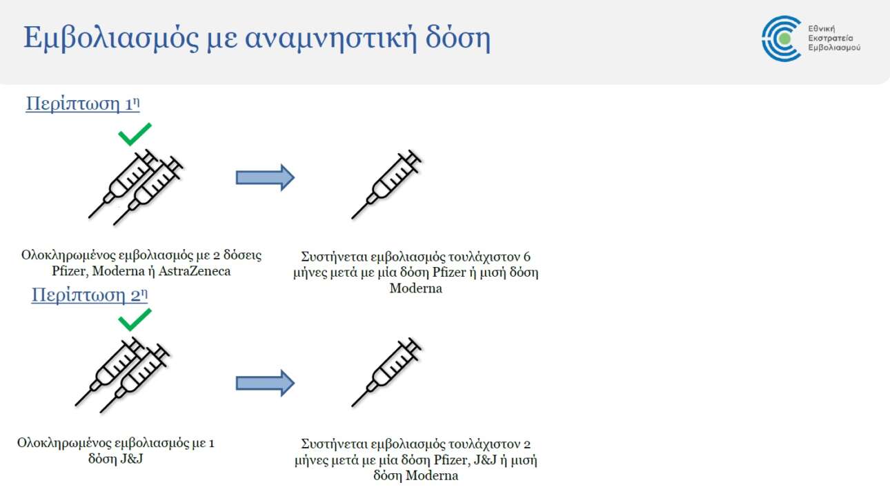 Για τα άτομα που έχουν ολοκληρώσει τον εμβολιασμό τους με εμβόλια Pfizer, Moderna ή AstraZeneca, η αναμνηστική δόση θα γίνεται έπειτα από έξι μήνες, με ολόκληρη δόση εμβολίου Pfizer ή με μισή δόση Moderna.